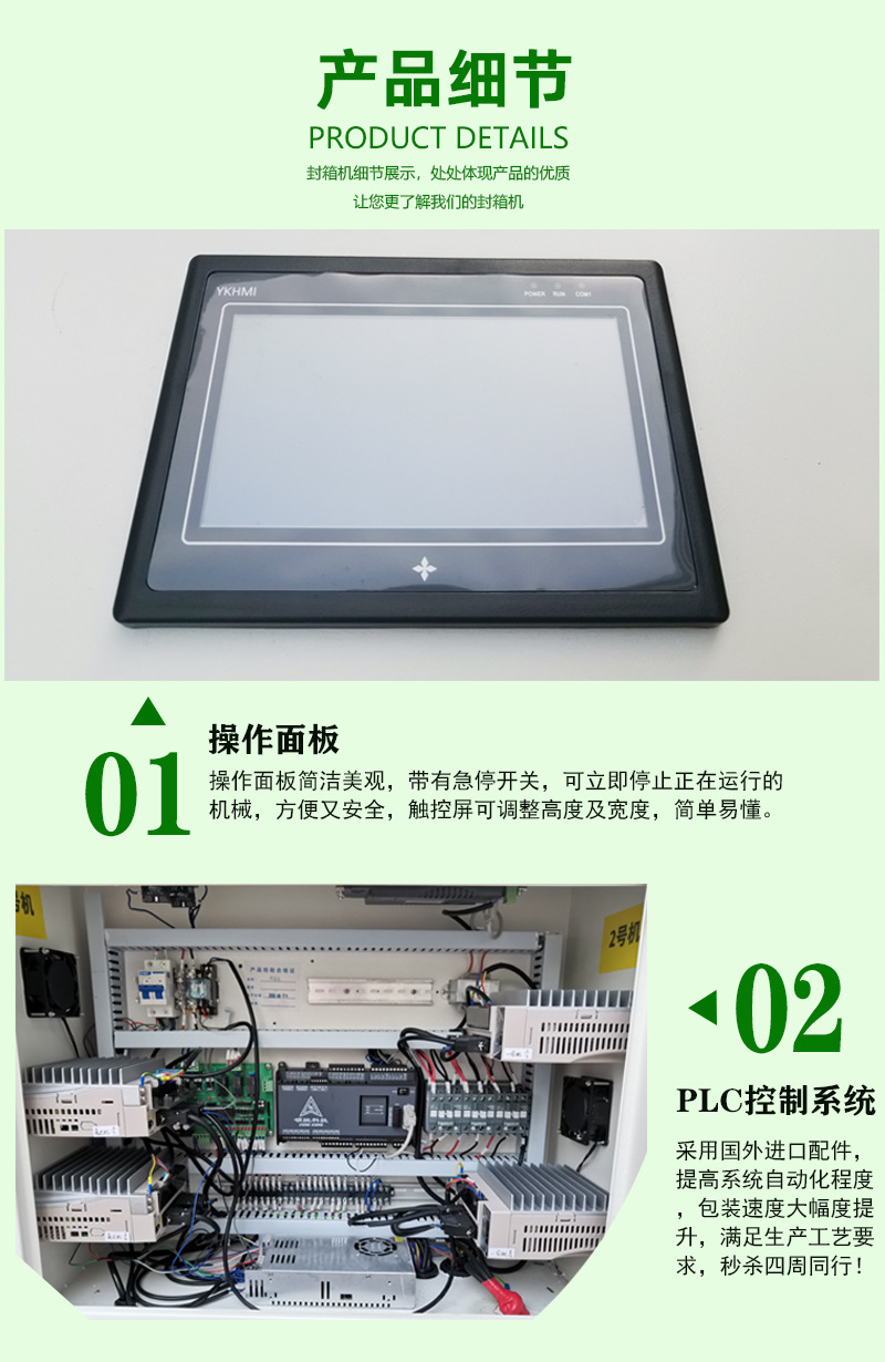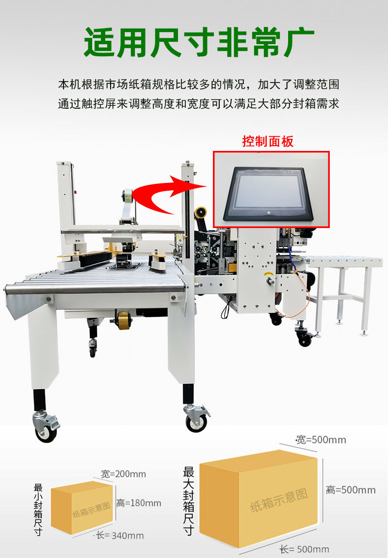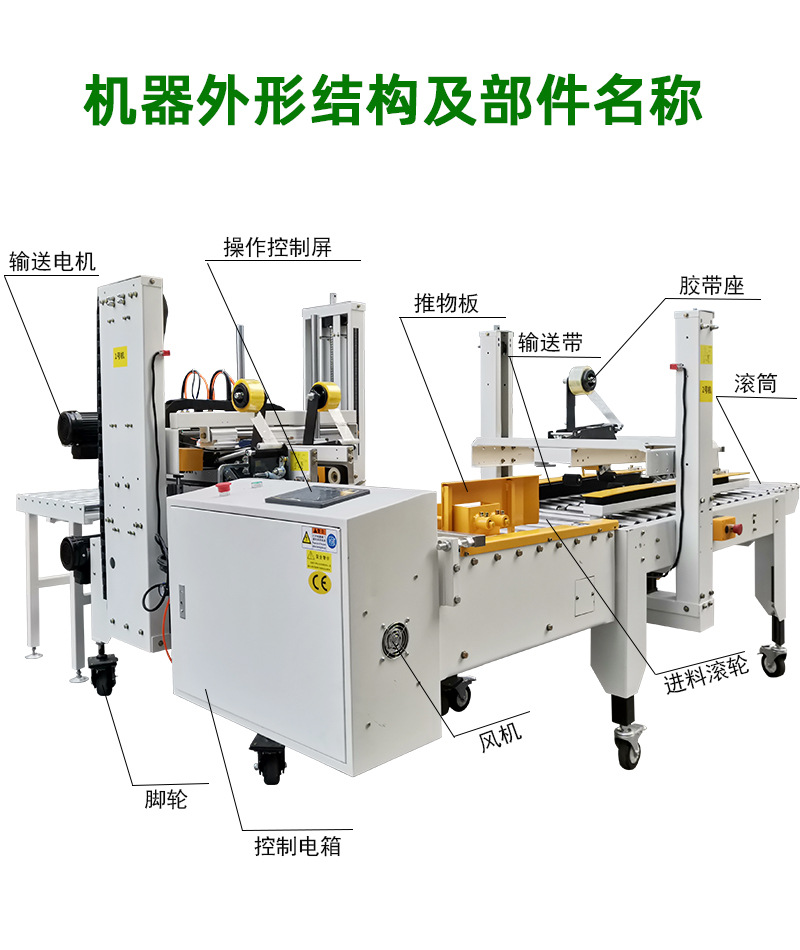 - 電控箱:內(nèi)部配備了先進(jìn)的電子控制系統(tǒng),用于控制整個封箱機(jī)的運(yùn)行,包括輸送帶的速度、封箱頭的動作、膠帶的輸送等,確保各個部件之間能夠協(xié)調(diào)工作4.