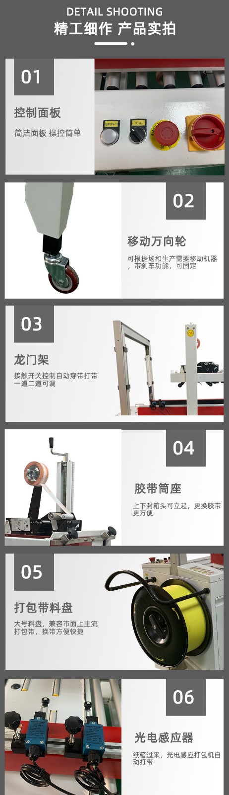 - 快速調節功能:可以根據不同大小、形狀的紙箱,手動或自動調節封箱和打包的尺寸參數,以適應多樣化的包裝需求,且調節過程簡單快捷1.