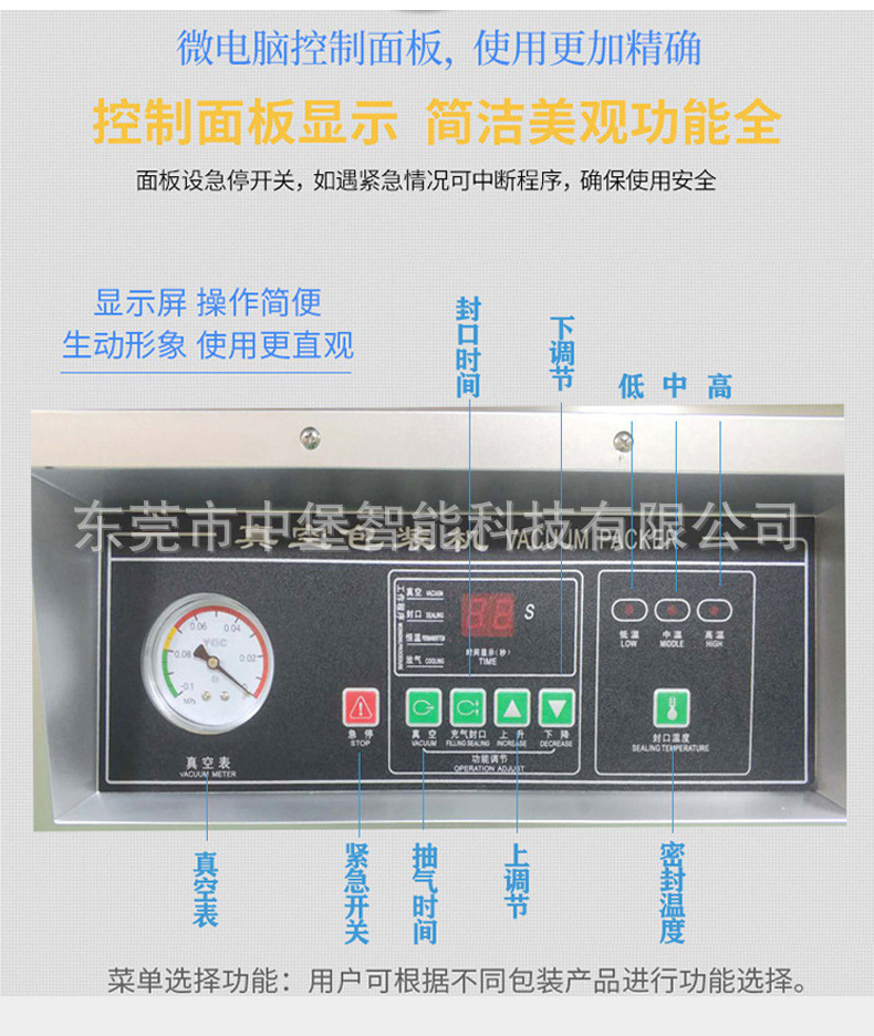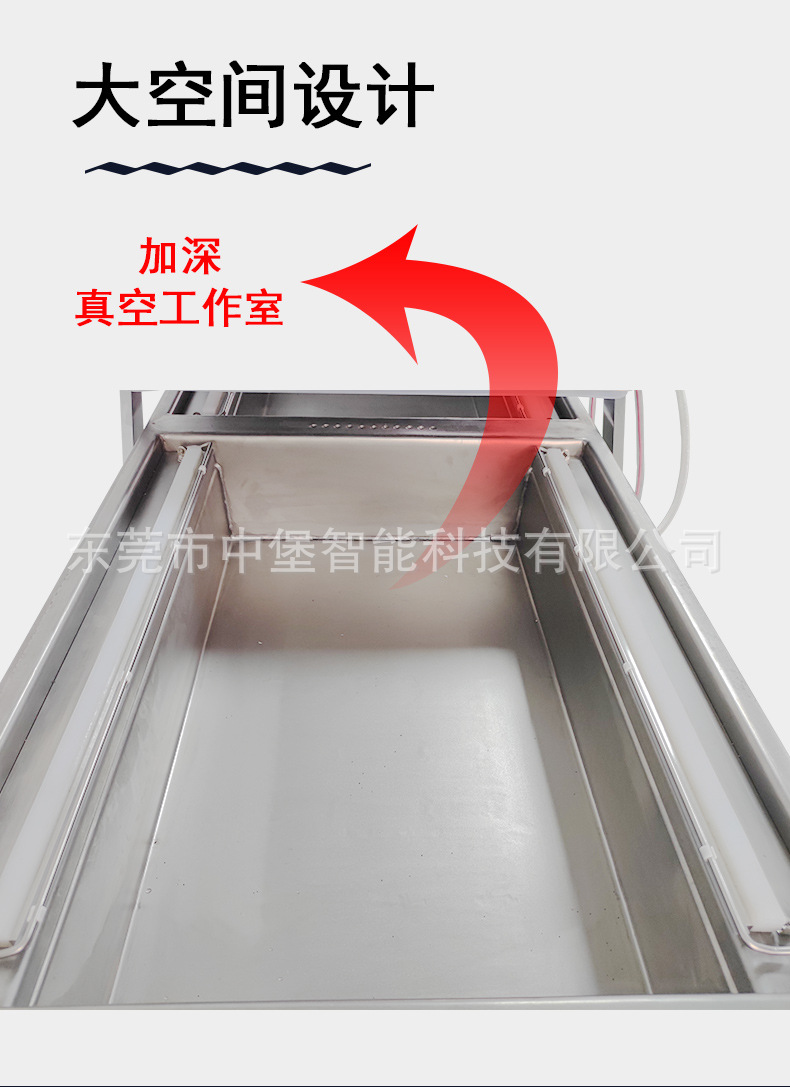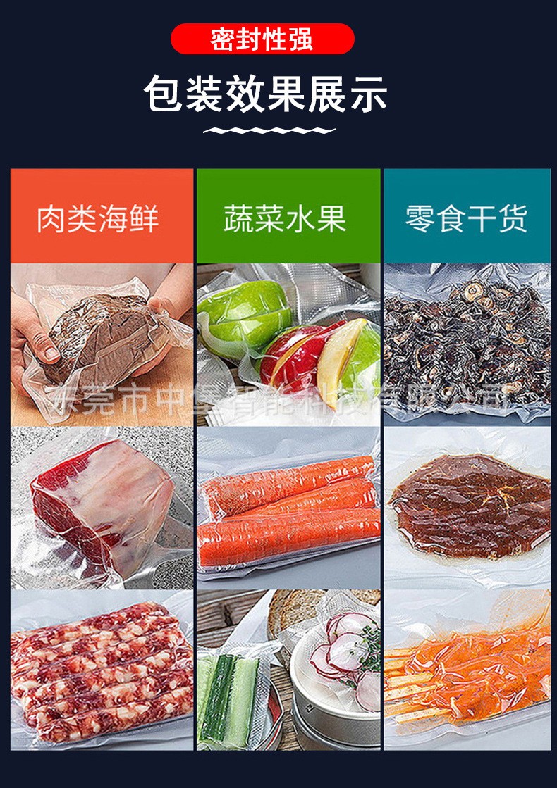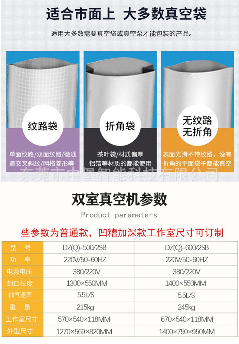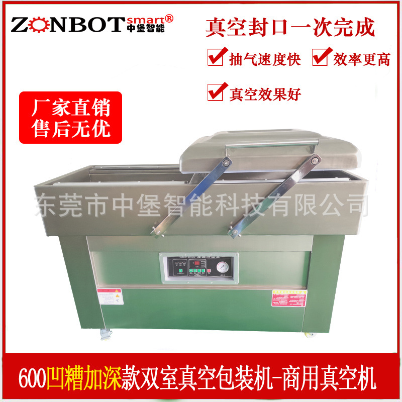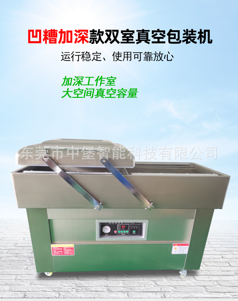 - 雙室凹槽真空包裝機:凹槽設計使其對各種形狀和大小的產品包裝有更好的適應性。對于不規(guī)則形狀的產品,如塊狀的肉類、海鮮,以及小尺寸的電子元件等,凹槽可以固定產品和包裝袋,確保抽真空和封口的效果。而且它可以同時處理不同形狀和大小的產品,只要選擇合適的包裝袋和凹槽。