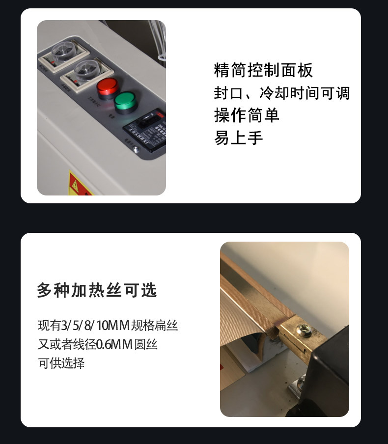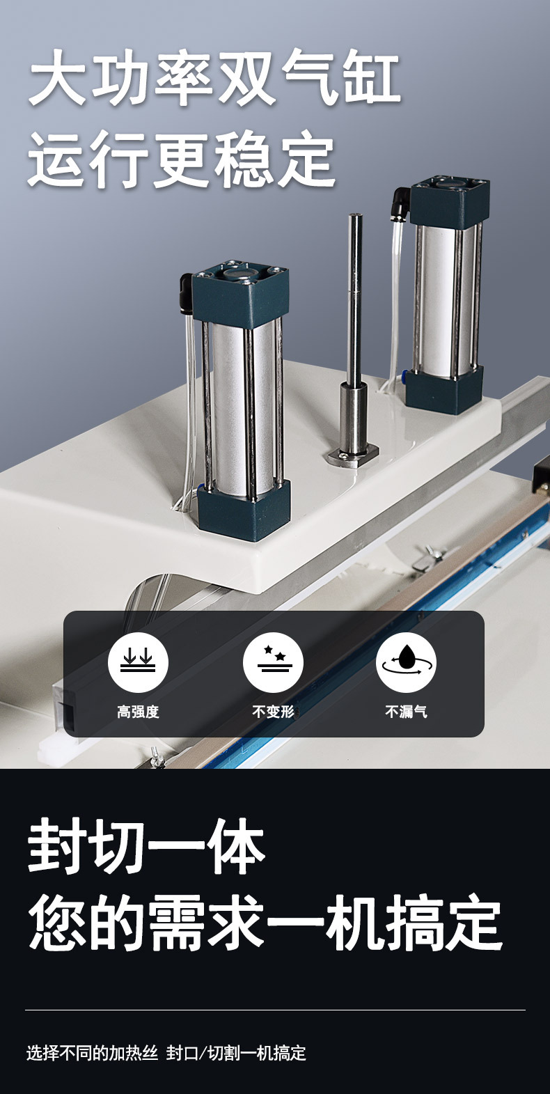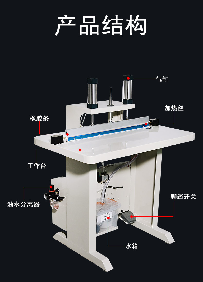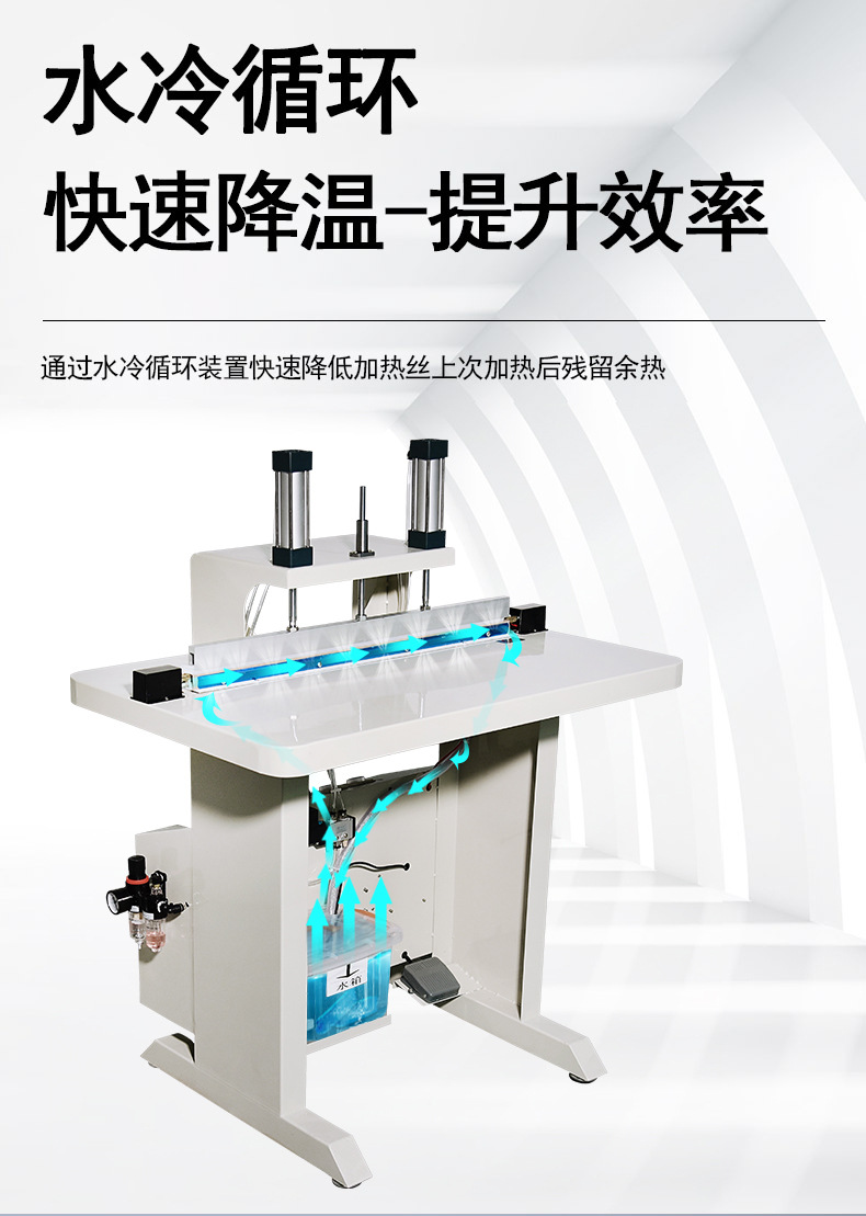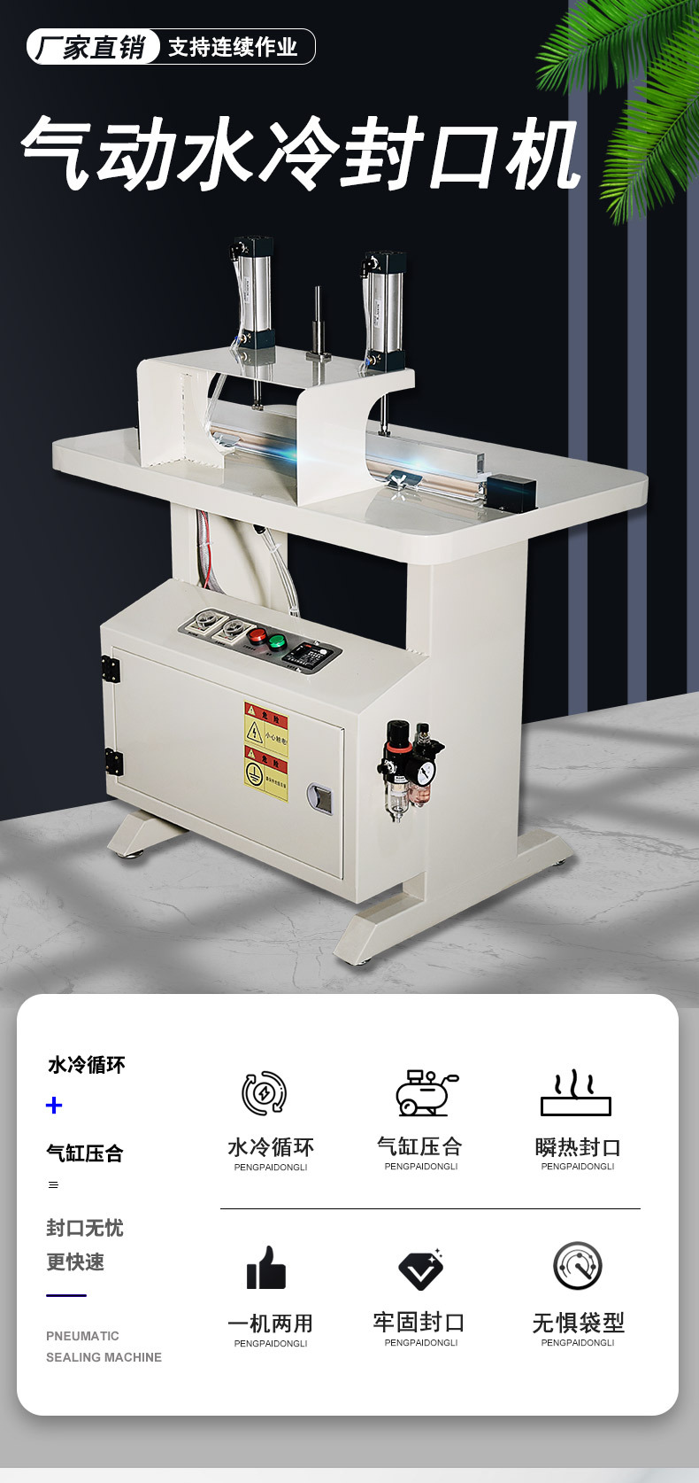- 啟動封口:踩下腳踏開關或按下操作面板上的封口按鈕,封口壓頭在氣缸(或其他動力裝置)推動下下壓,包裝袋與加熱的封口條緊密貼合,封口處塑料受熱熔融;與此同時,水冷系統同步運行,帶走熱量促使封口快速冷卻定型。