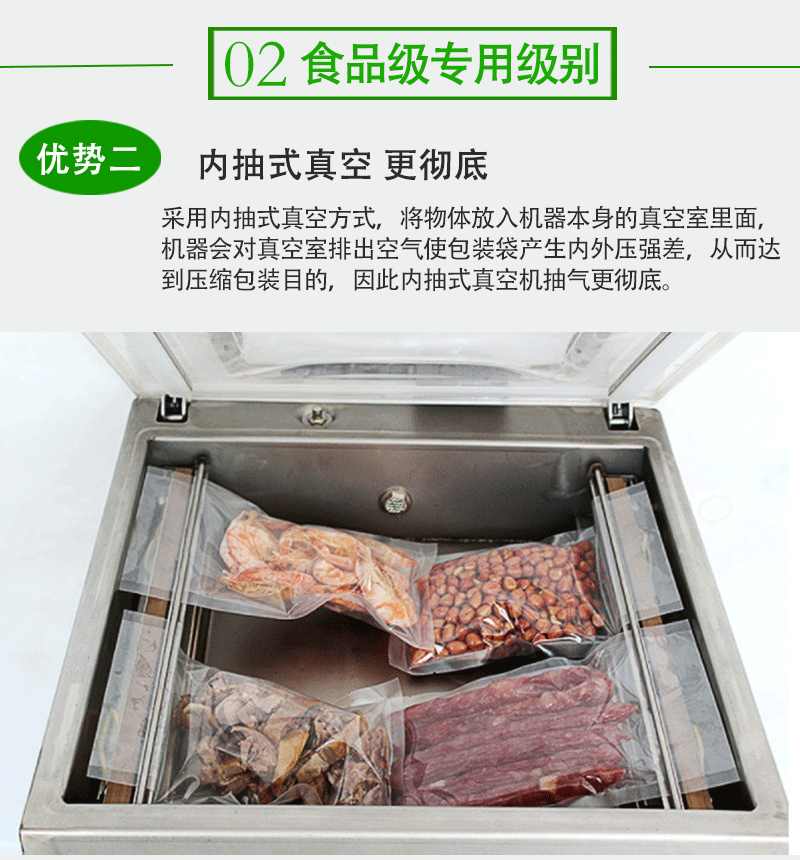 單室內抽真空包裝機可對酸菜、粽子、五金配件等產品抽真空封口包裝,密封包裝延長保質期