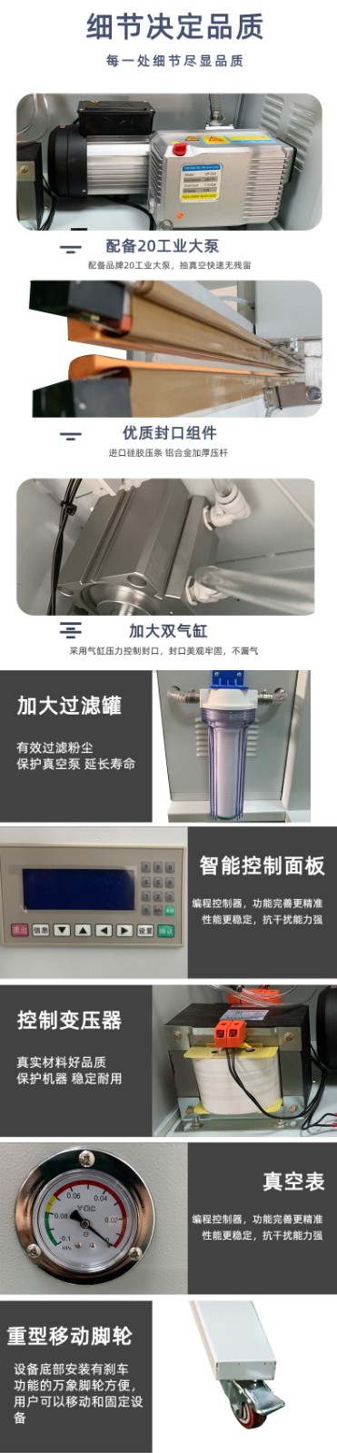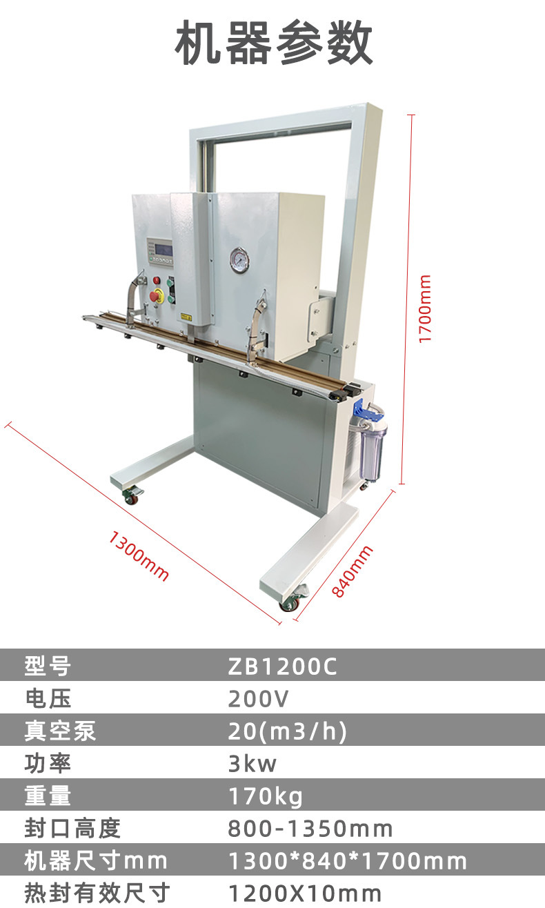 - 真空室直徑 / 尺寸:如 400mm、600mm×800mm 等,反映可容納包裝物的空間大小。