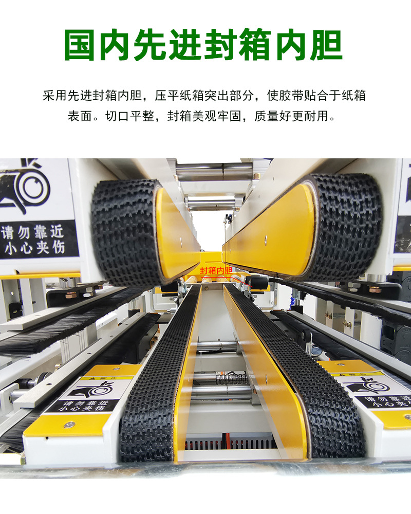 - 封箱機(jī)構(gòu):分為上部封箱頭與下部封箱頭,各自配備有膠帶座、壓帶輪、加熱裝置、刀片等組件。膠帶座用來放置膠帶卷,壓帶輪負(fù)責(zé)輸送膠帶,加熱裝置激活膠帶黏性,刀片則在封箱結(jié)束時(shí)切斷膠帶。
